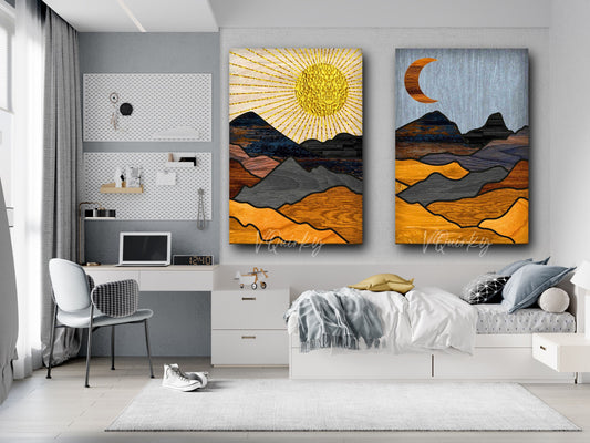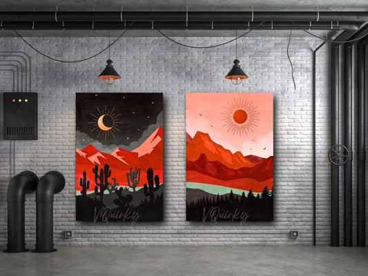 Boho Mountains Sun & Moon - Set Of 2 Canvas Painting