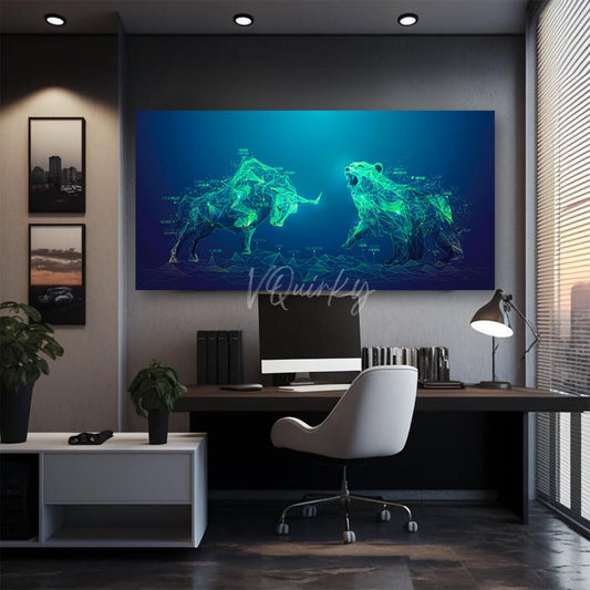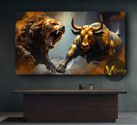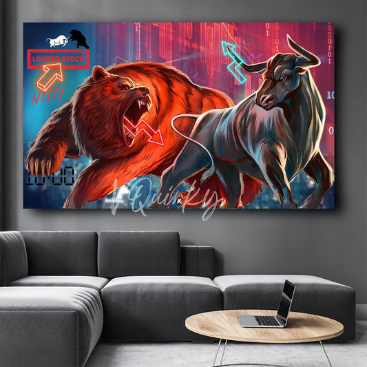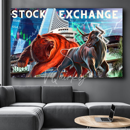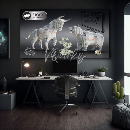 Discover our stunning Stock Market Canvas Paintings Collection. Each piece is meticulously created with top-notch materials for long-lasting beauty. Perfect for stock market enthusiasts, these paintings will elevate the look of any office, home, or living space. Featuring iconic symbols like Bear and Bull, Stock Market logos, Wall Street, NIFTY, BSE, NSE and Trading images, these pieces capture the essence of the stock market world. Suitable for all ages and anyone involved in Stock Exchanges. Add a touch of sophistication to your space with our stock market Canvas Paintings!