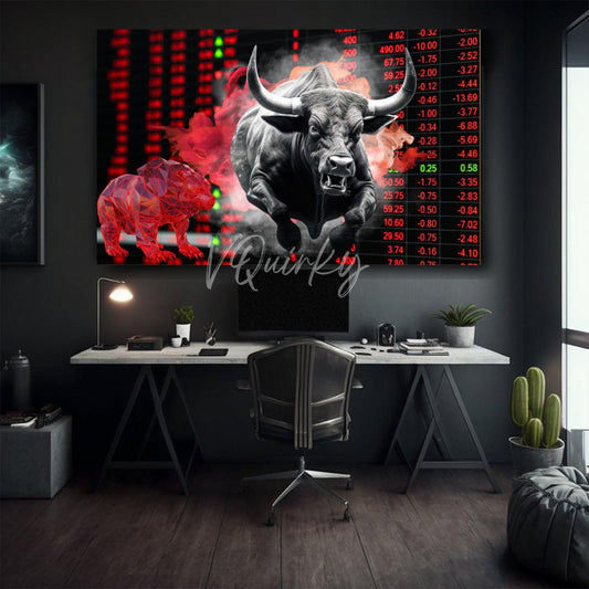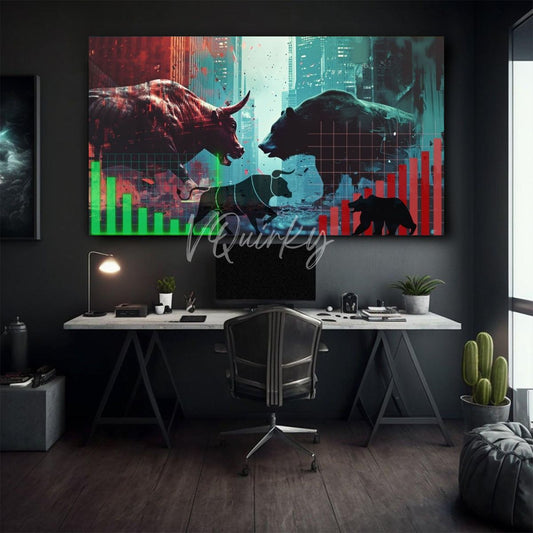 Discover our stunning Stock Market Canvas Paintings Collection. Each piece is meticulously created with top-notch materials for long-lasting beauty. Perfect for stock market enthusiasts, these paintings will elevate the look of any office, home, or living space. Featuring iconic symbols like Bear and Bull, Stock Market logos, Wall Street, NIFTY, BSE, NSE and Trading images, these pieces capture the essence of the stock market world. Suitable for all ages and anyone involved in Stock Exchanges. Add a touch of sophistication to your space with our stock market Canvas Paintings!