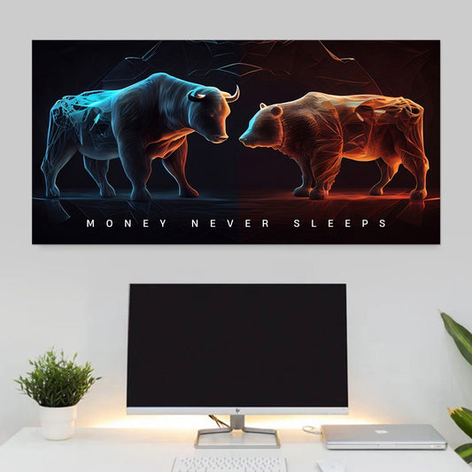 Bull vs Bear Money Never Sleep Horizontal Stock Market Trading Canvas Painting